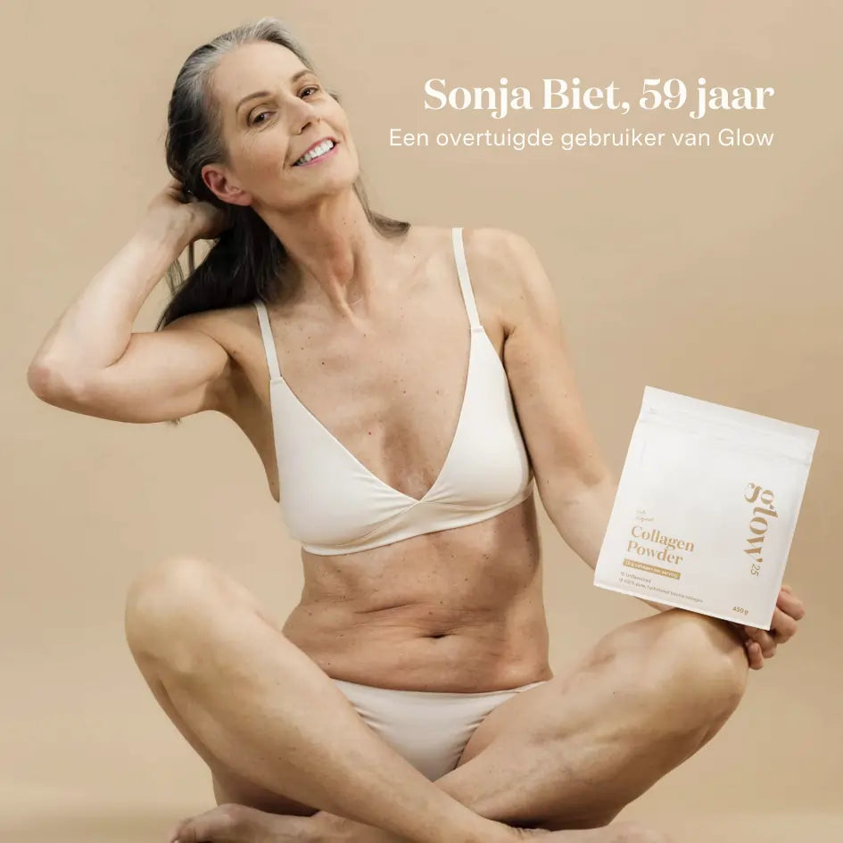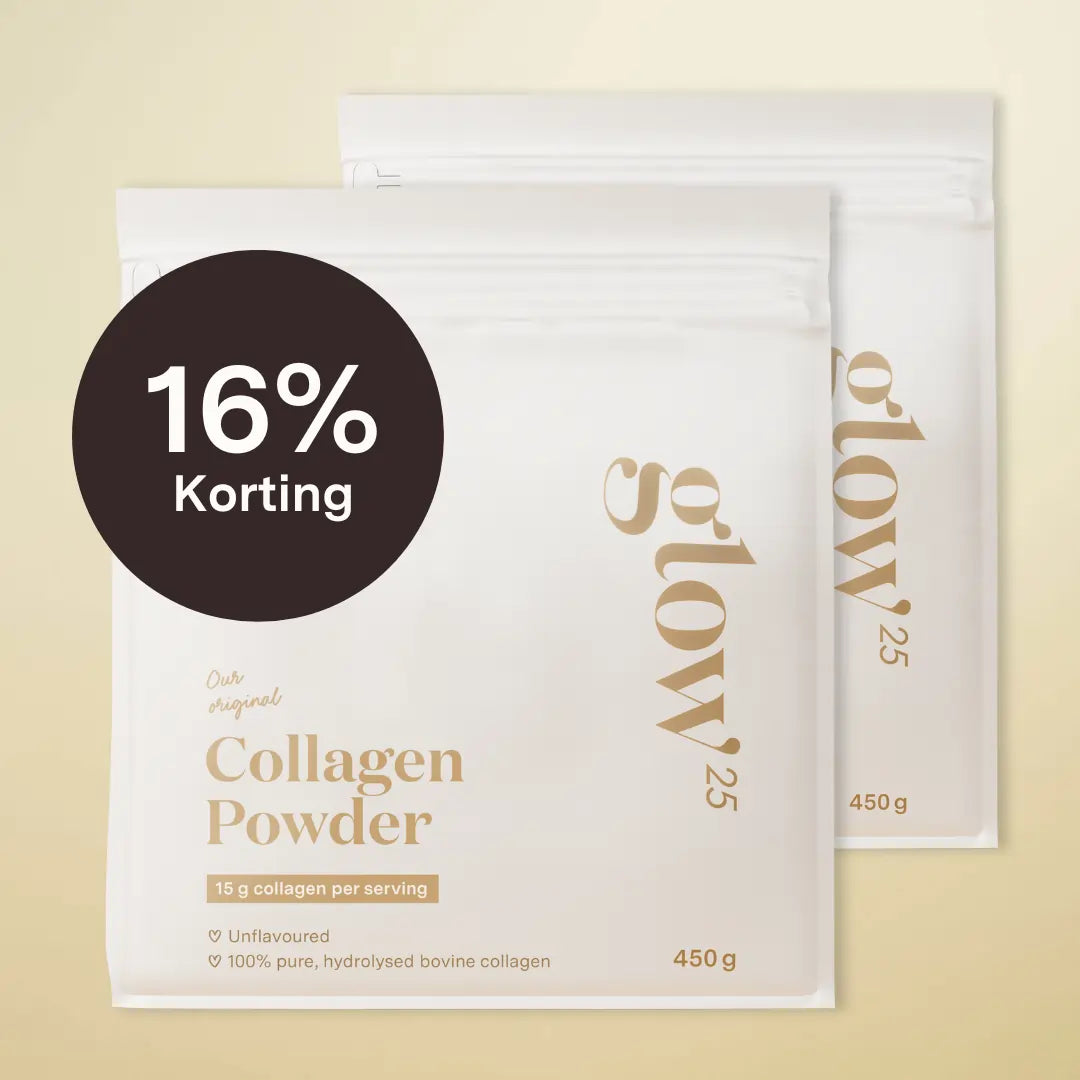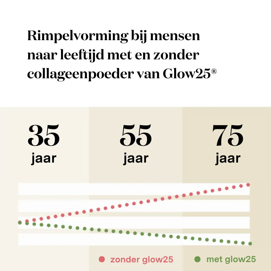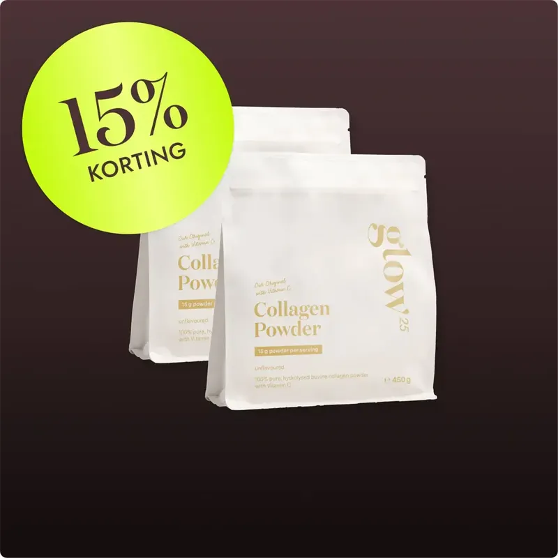 Ons lichaam maakt collageen aan, maar na je 25e neemt dat langzaam af. Dit merk je aan een minder stevige huid, brozere nagels of dunner haar. Glow25 helpt je lichaam van binnenuit door deze belangrijke bouwstof aan te vullen, zonder gedoe, gewoon in je dagelijkse routine.