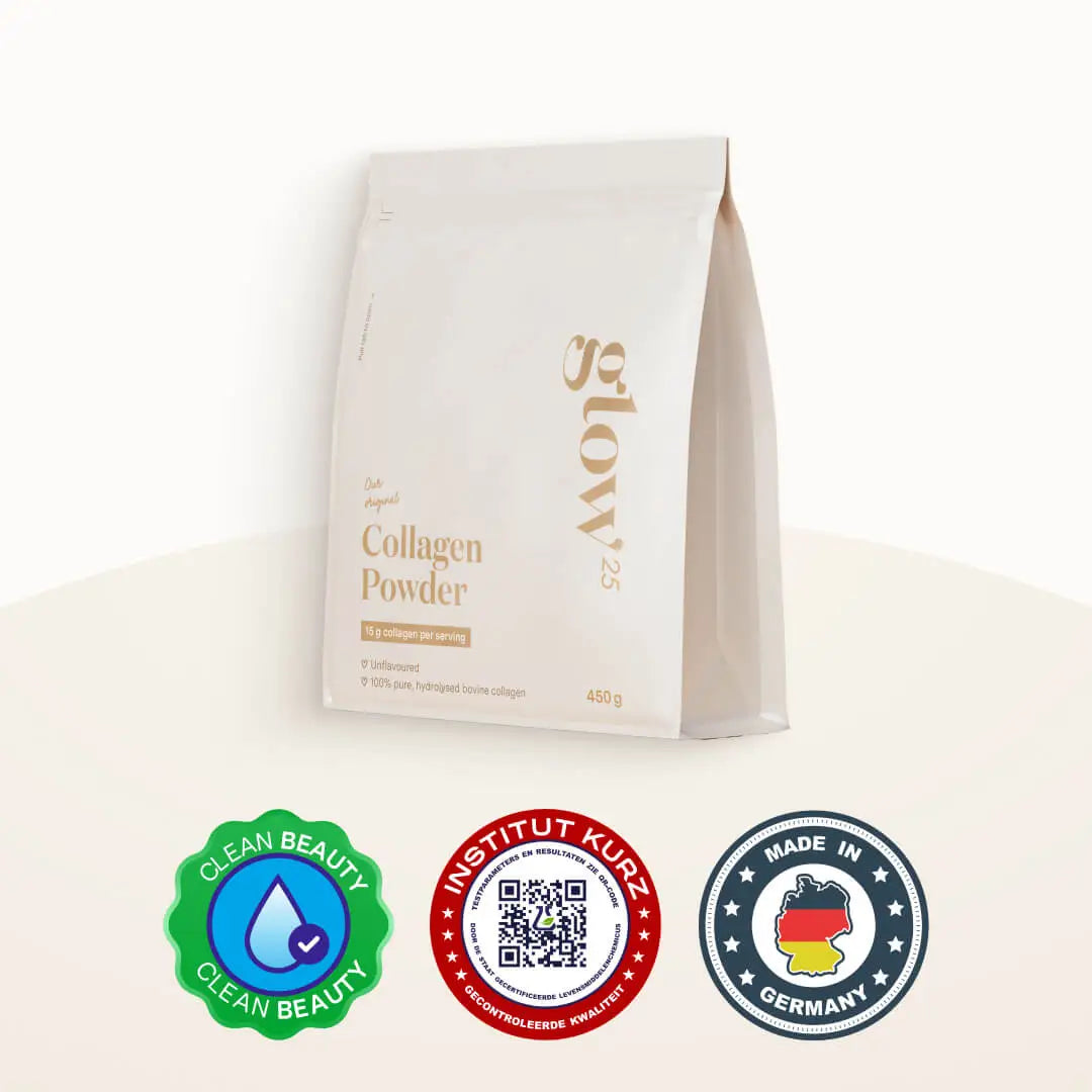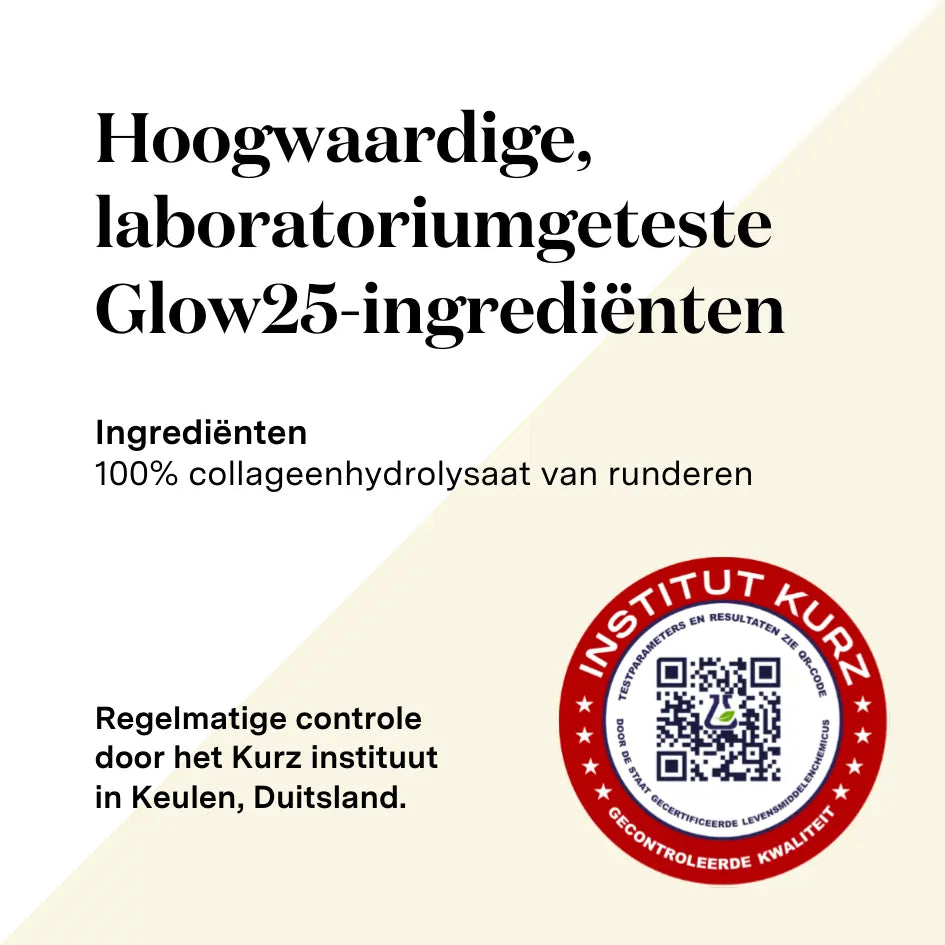Glow25® collageenpoeder is vrij van additieven, van nature zuivel- en glutenvrij en wordt regelmatig getest op zuiverheid en effectiviteit door onafhankelijke laboratoria.