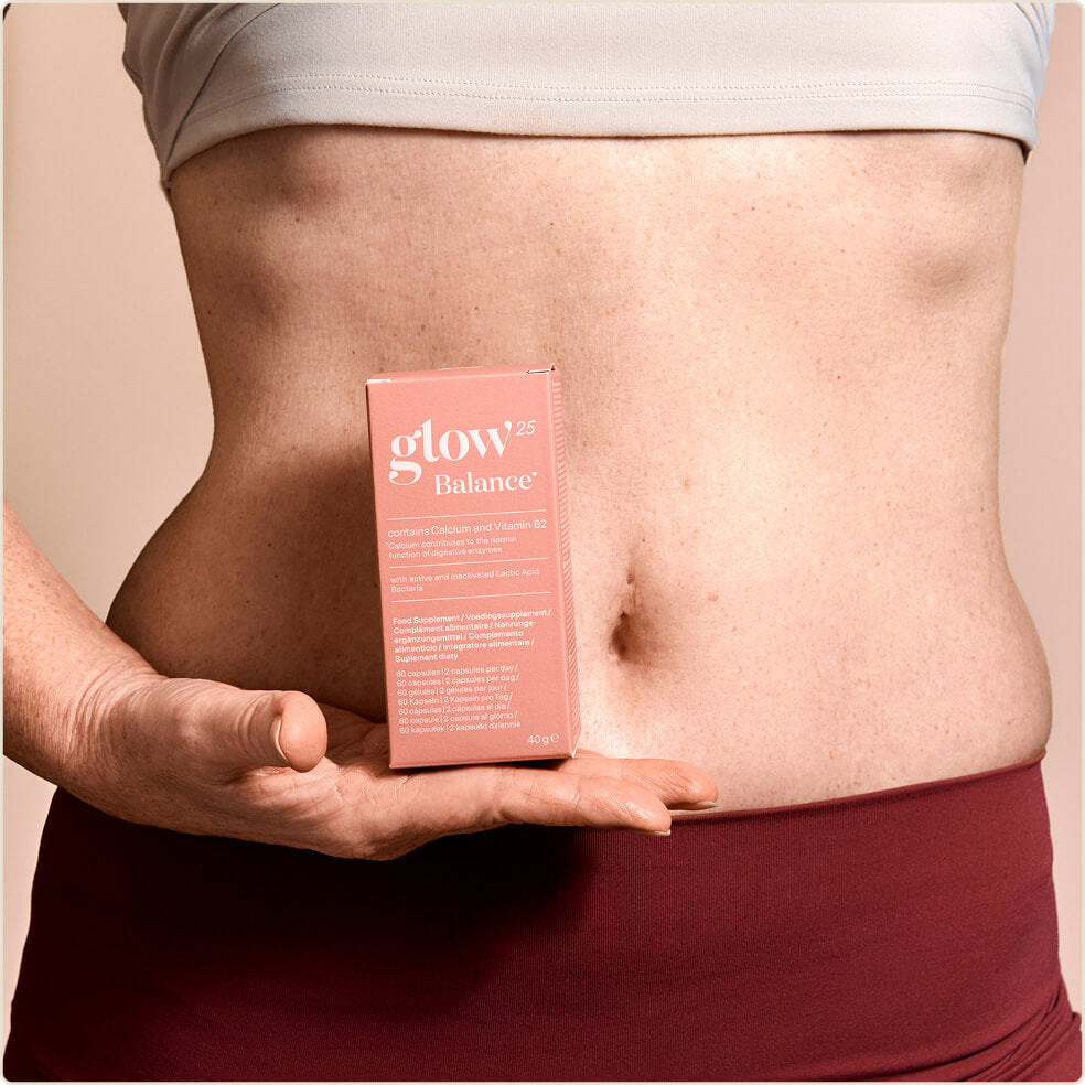 Glow25 Balance is ontwikkeld zodat jij ontspannen kunt blijven, waar je ook bent. Al 2 capsules per dag kalmeren je darmen, nemen het drukgevoel weg en laten je lichter voelen. Het resultaat: een fijn, comfortabel gevoel in plaats van een opgeblazen buik.