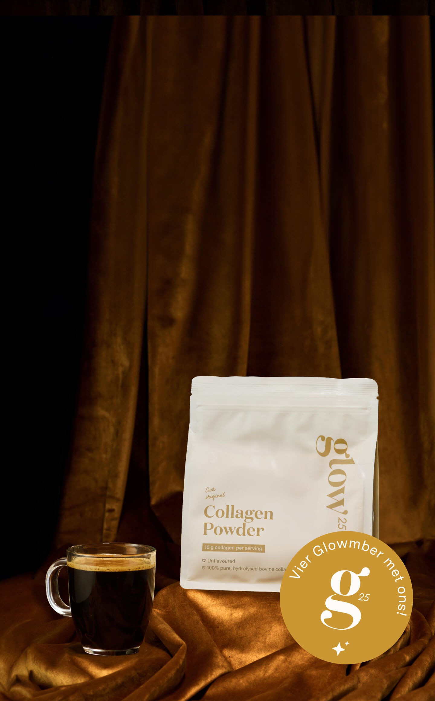 Wij raden aan om voor een energieke start van de dag 1 eetlepel Glow collageenpoeder aan de koffie toe te voegen. Jouw Glow Koffie staat klaar.