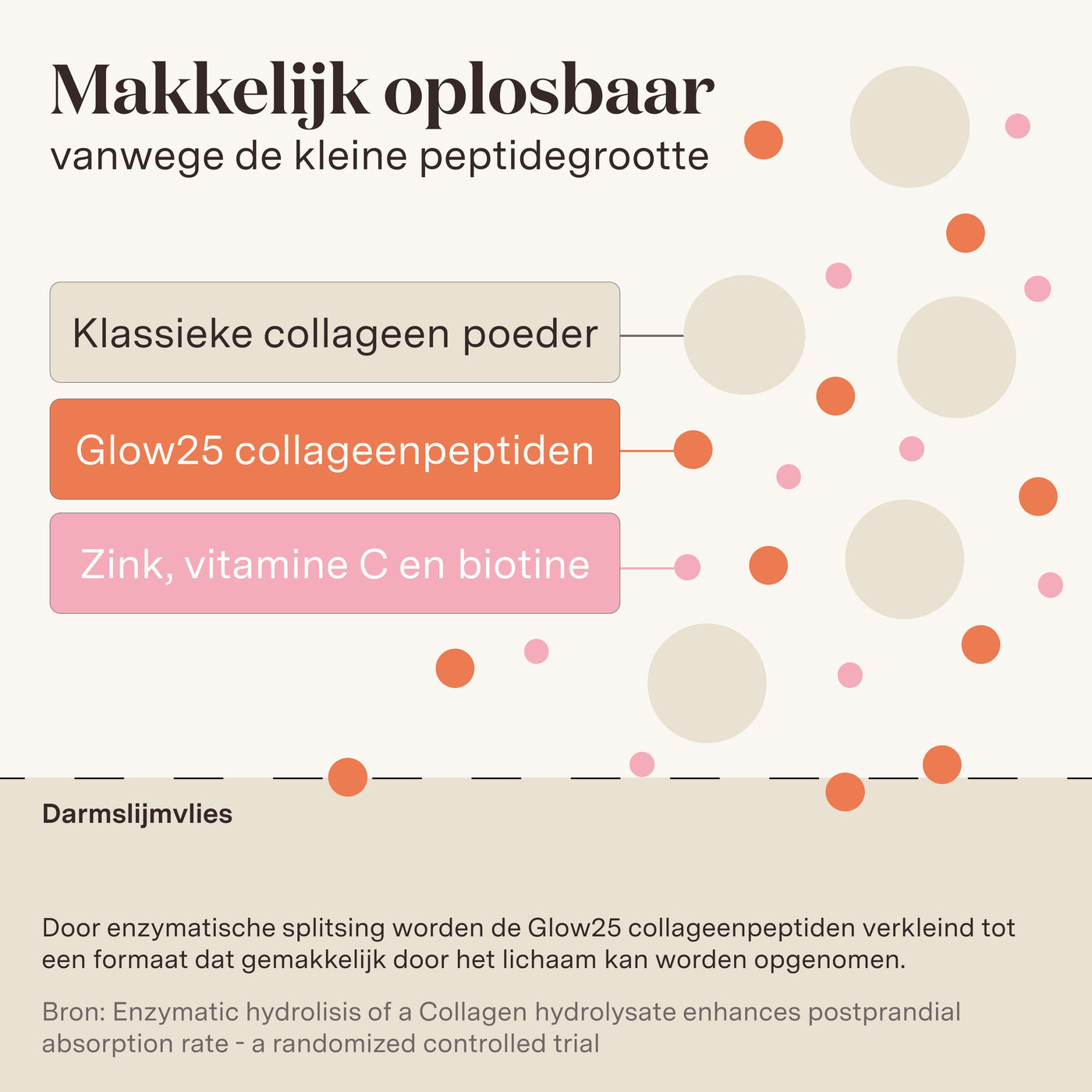 Glow25 is geoptimaliseerd voor opname: micropeptiden van 0,3 - 0,5 kDa, klinisch gevalideerd, 93% opname, een volledige collageenmix (Type I, II & III), getest op zuiverheid en geproduceerd volgens farmaceutische EU-standaarden. Je voelt én ziet het verschil.