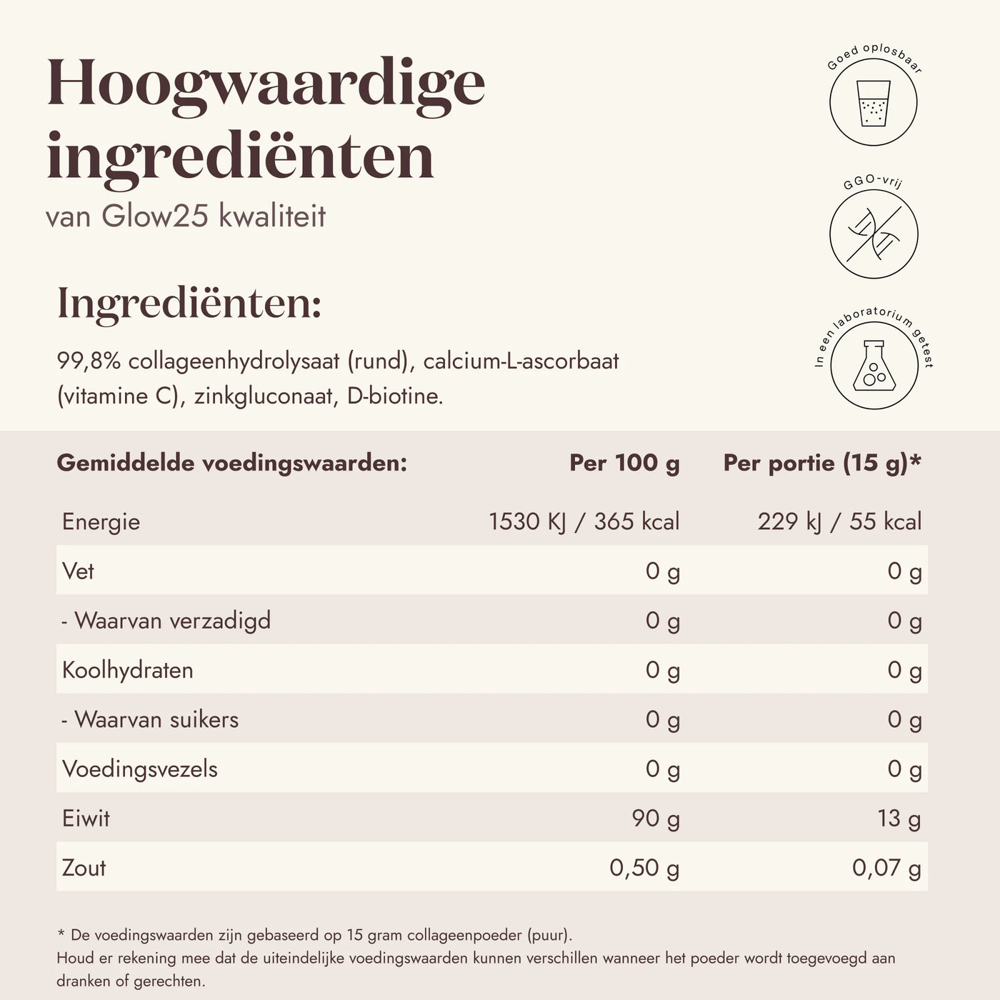 Glow25® is niet zomaar een collageenpoeder. Het is ontwikkeld om echt verschil te maken; puur natuur, effectief en makkelijk op te nemen door je lichaam.